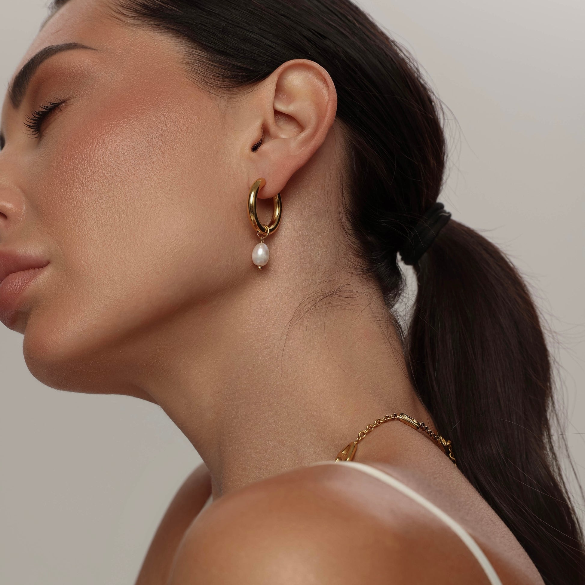 Kolczyki wykonane ze stali chirurgicznej, są odporne na wodę i nie czernieją. Średnica kółeczka 20 mm, zawieszka wykonana z naturalnej perły.