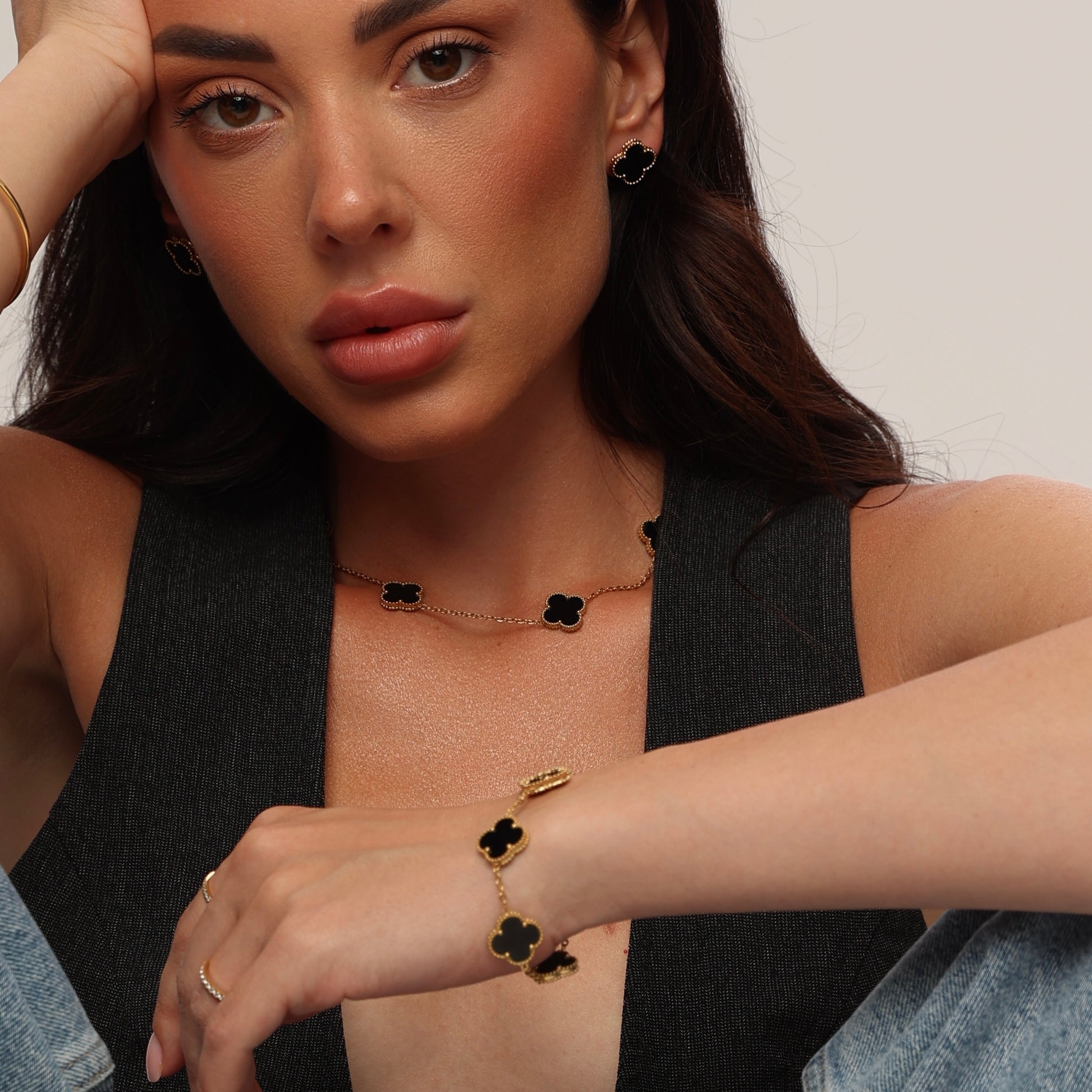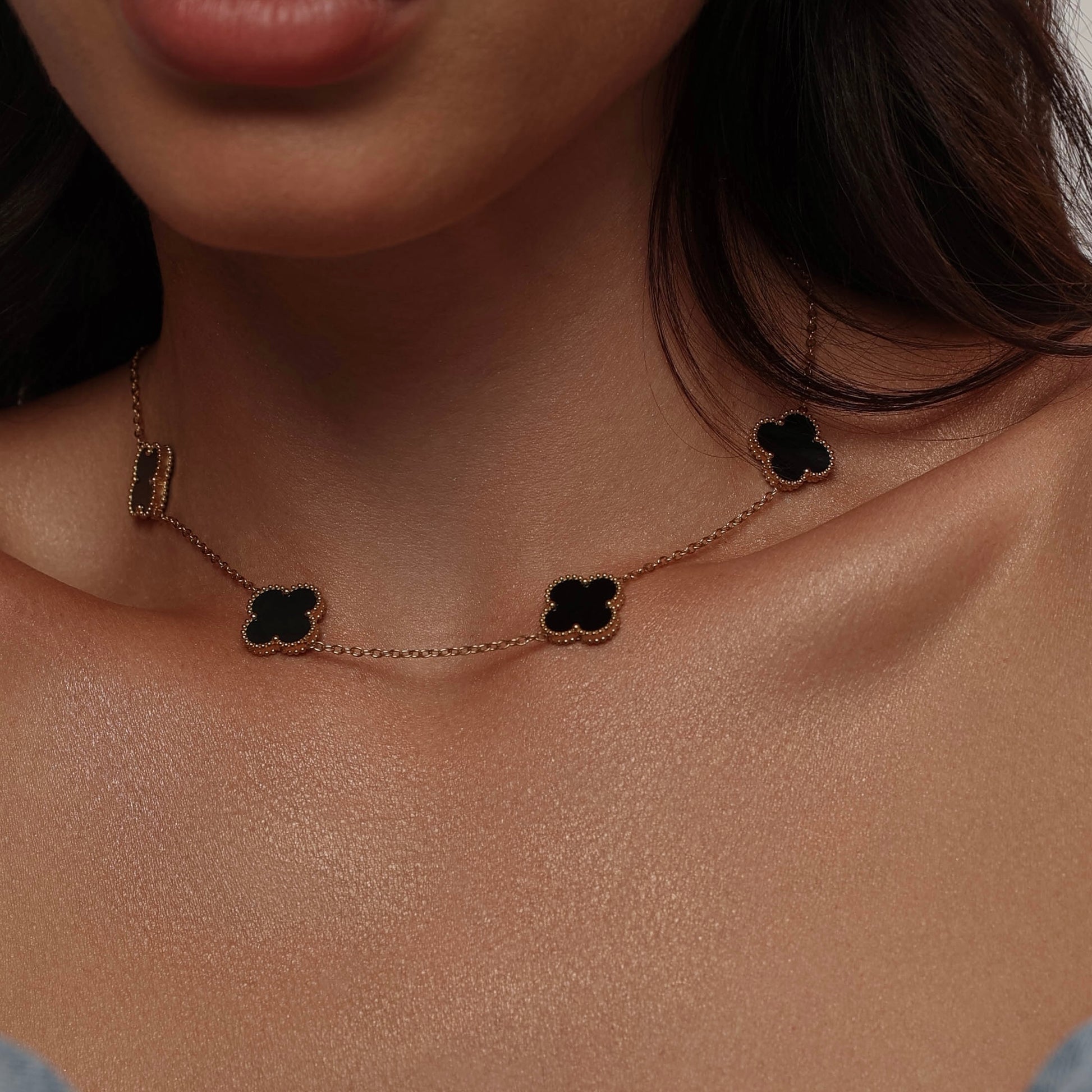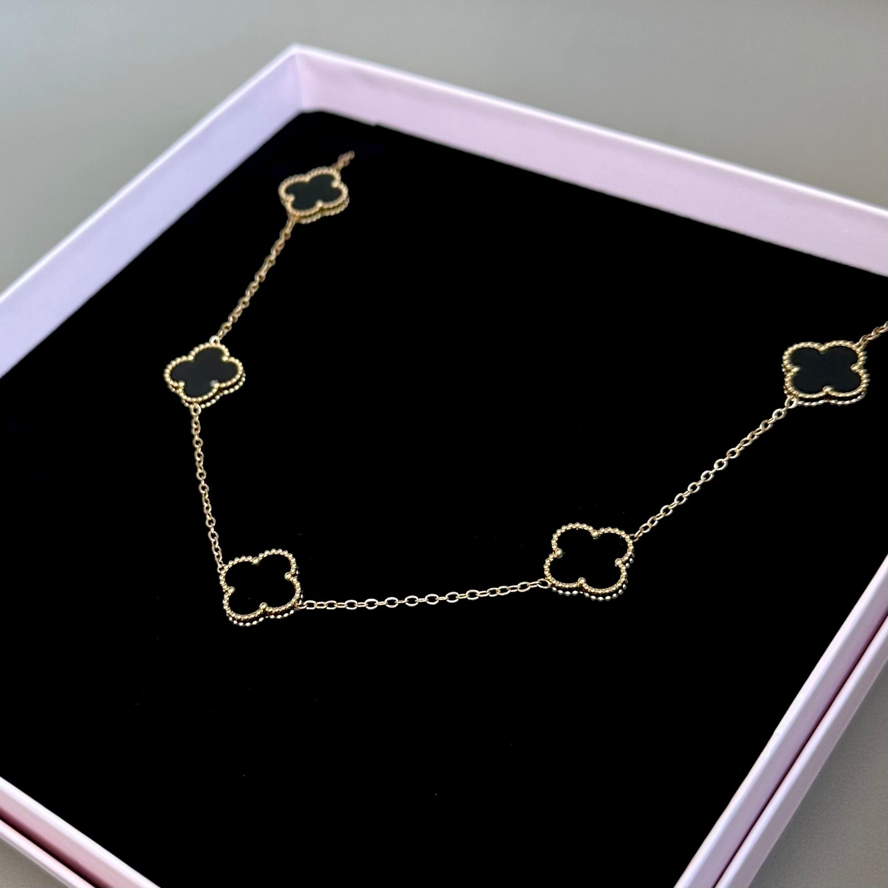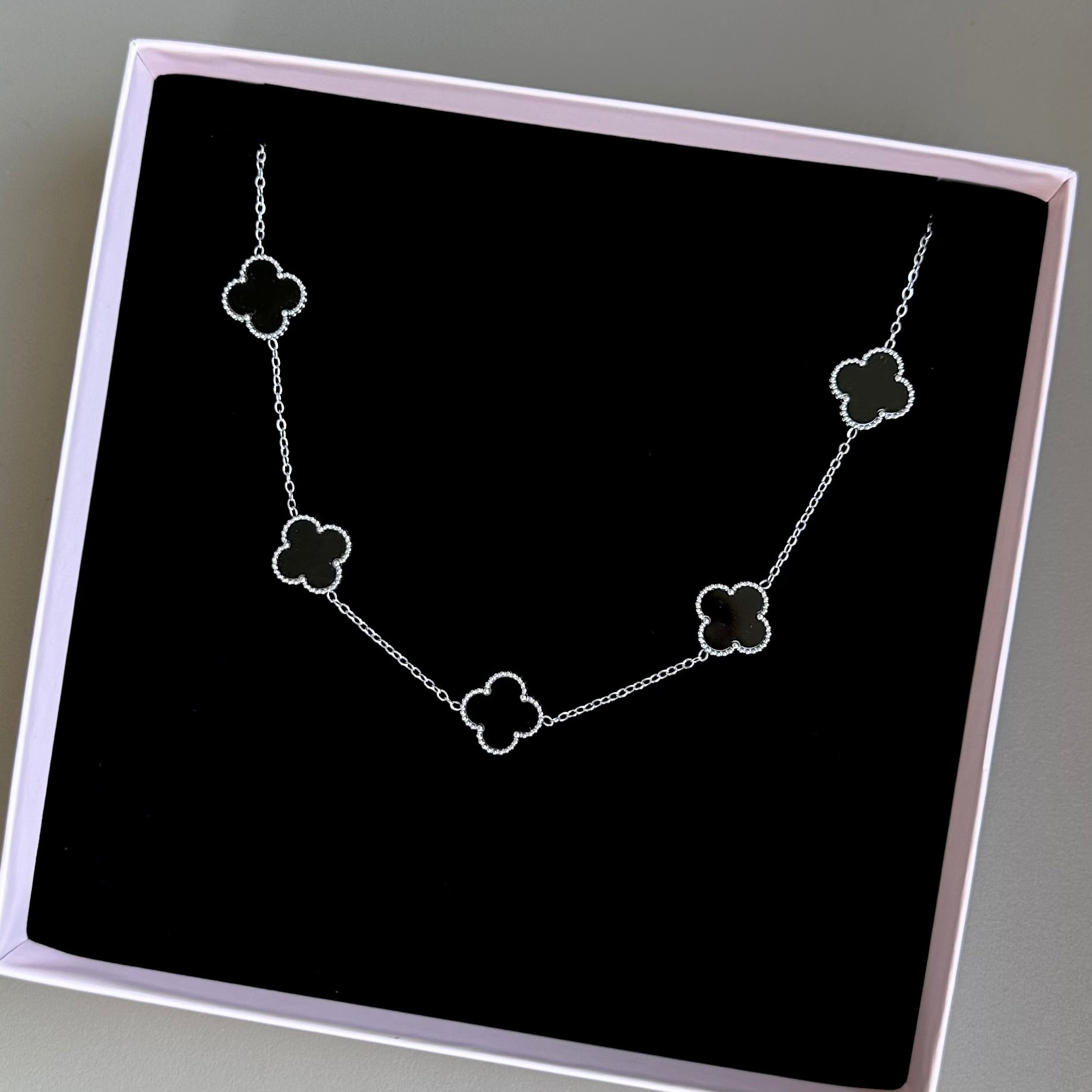 Naszyjnik wykonany ze stali chirurgicznej, jest odporny na wodę i nie czernieje. Długość naszyjnika 40 cm + 5 cm łańcuszek wydłużający. Koniczynki obustronne, średnica 15 mm.