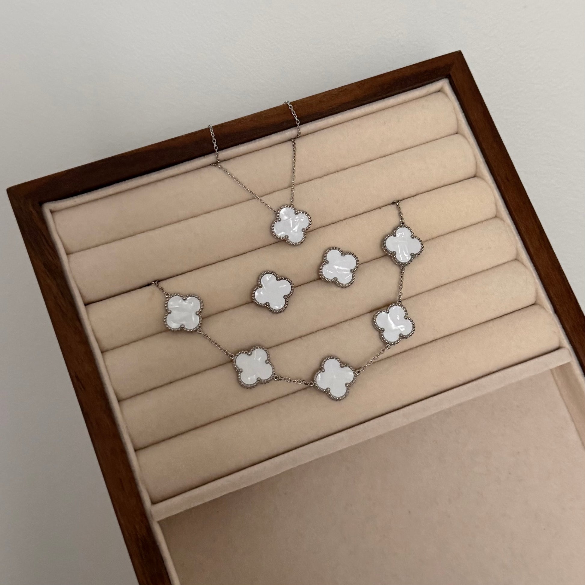 W komplecie znajduje się naszyjnik, kolczyki oraz wzmocniona bransoletka, która dzięki dodatkowym łączeniom jest odporna na zerwanie przy codziennym noszeniu 💌