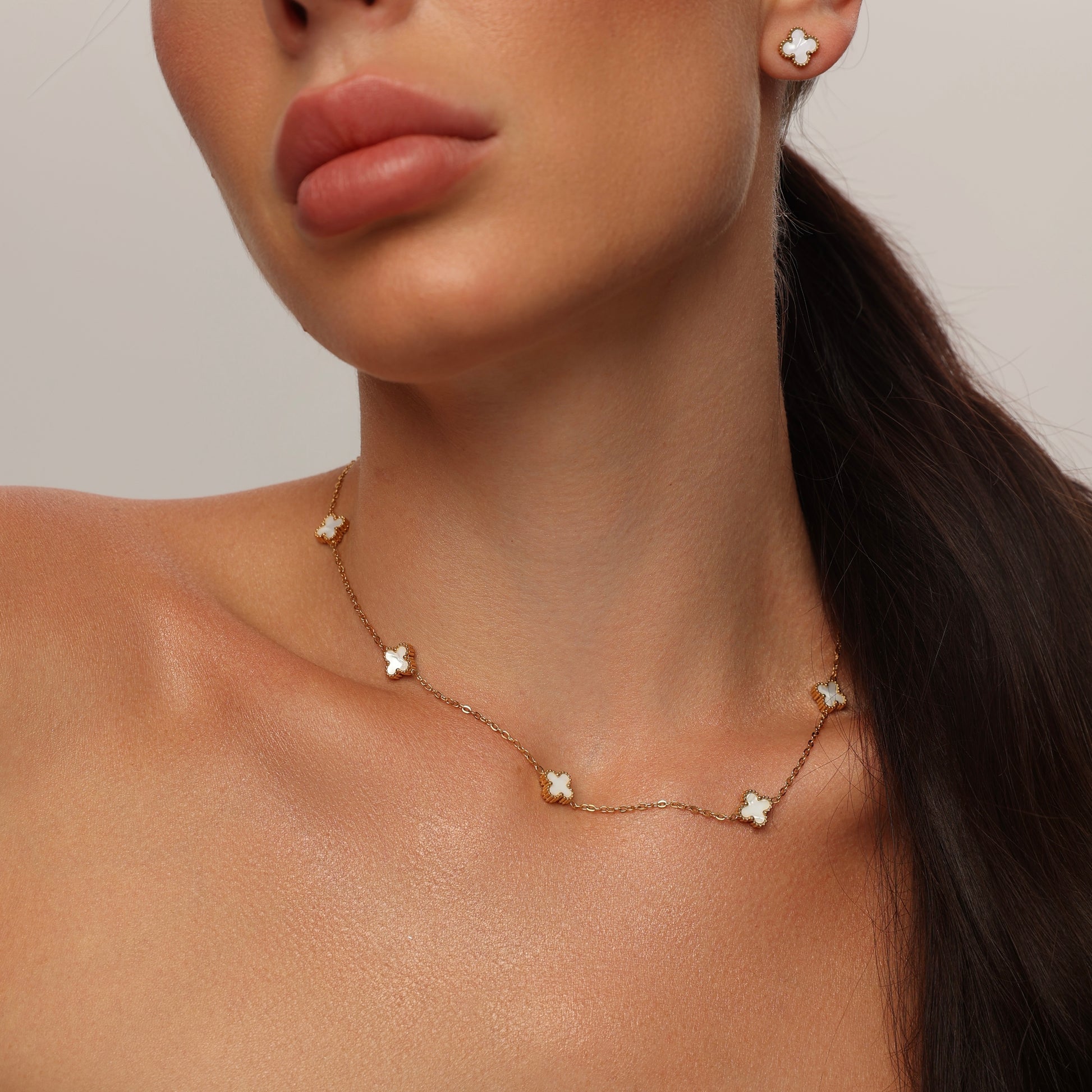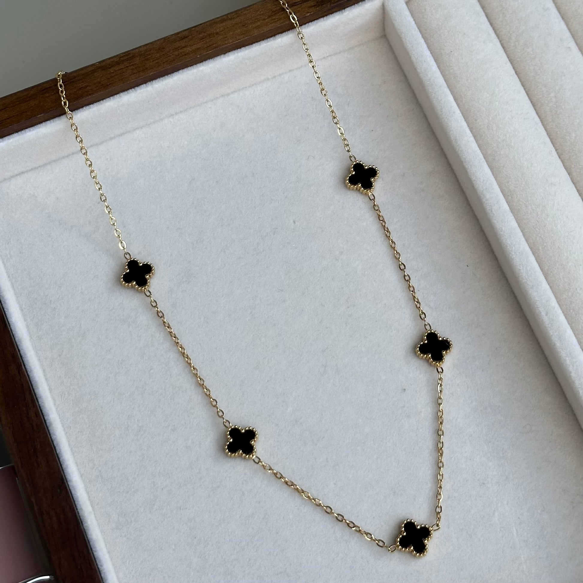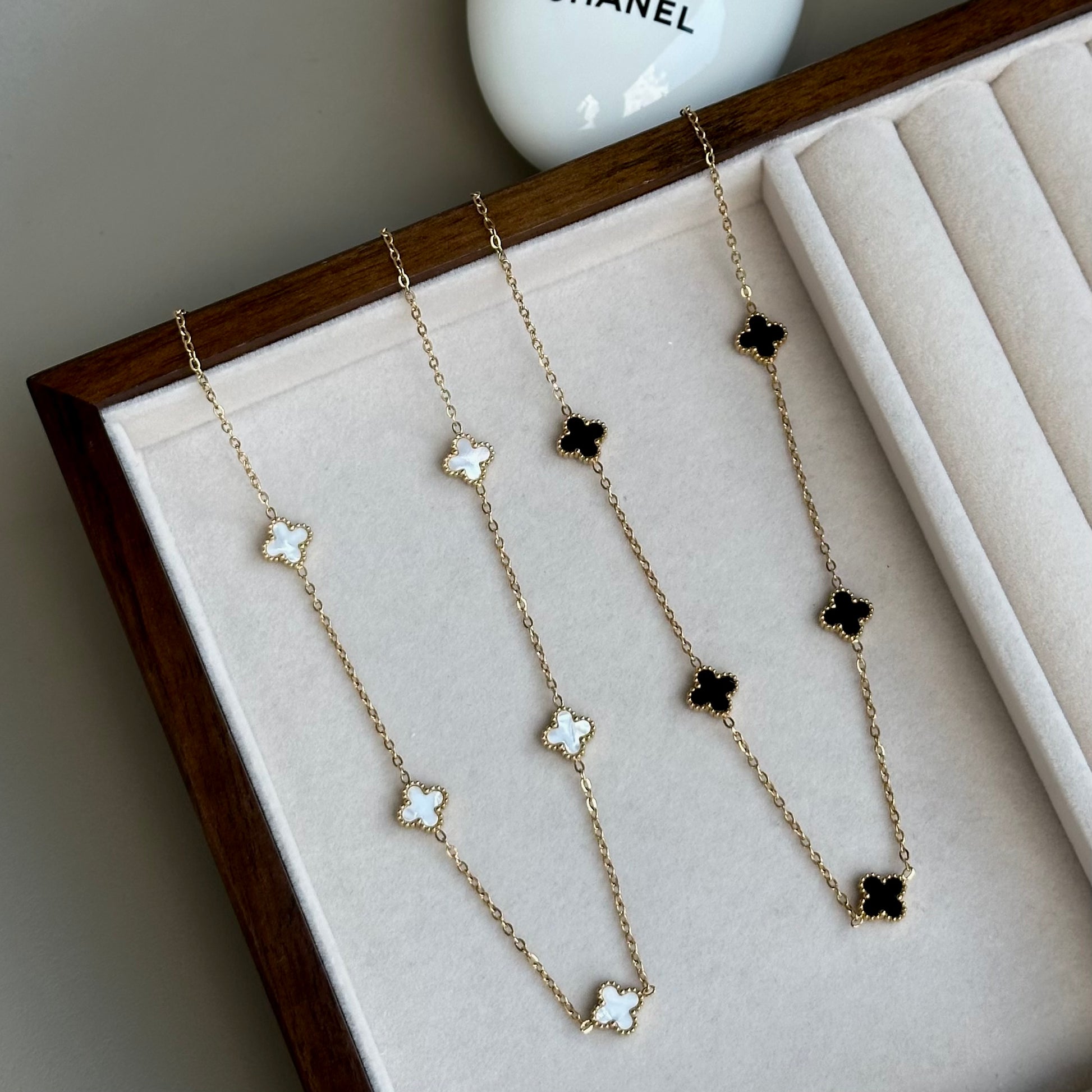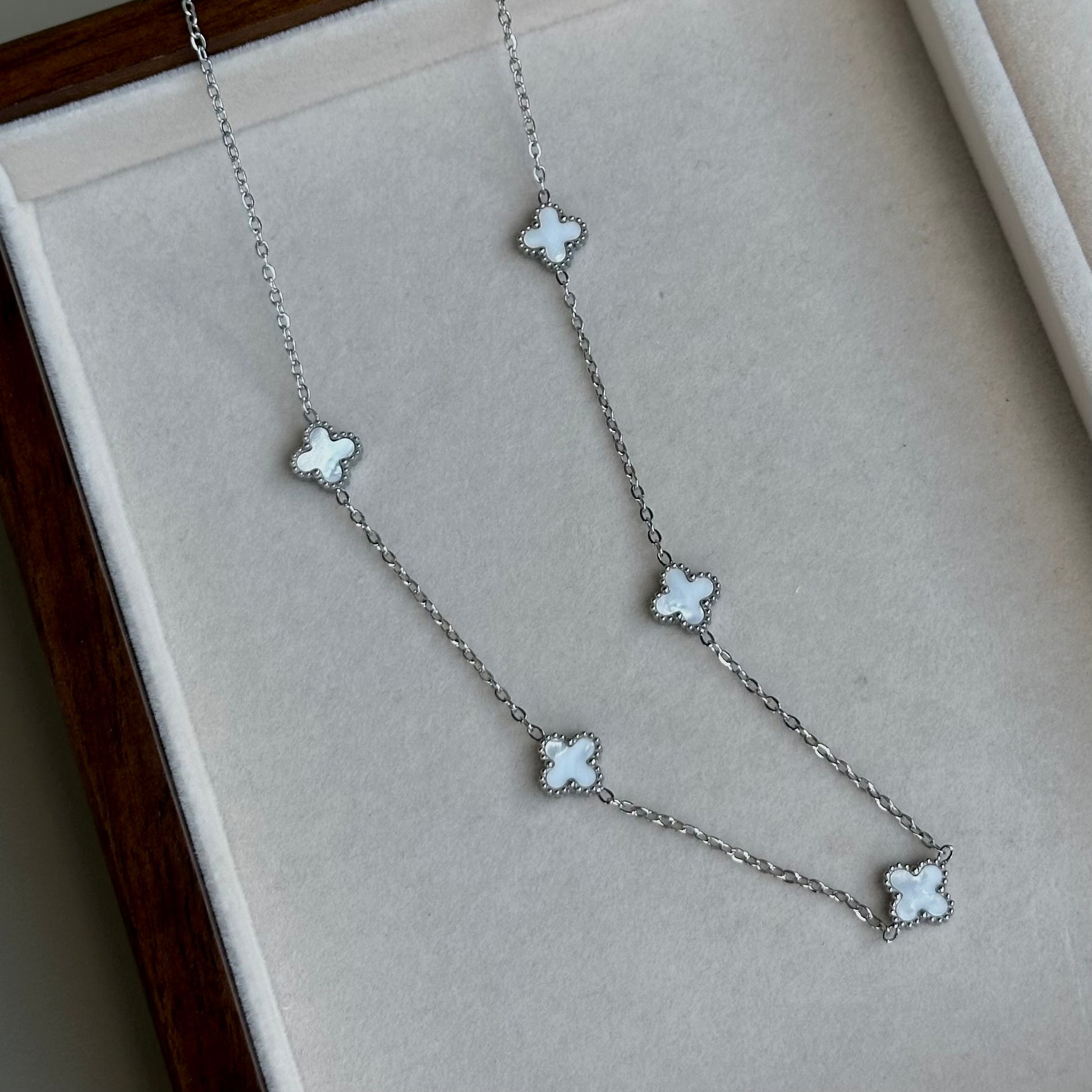 Naszyjnik wykonany ze stali chirurgicznej, jest odporny na wodę i nie czernieje. Długość naszyjnika 40 cm + 5 cm łańcuszek wydłużający. Średnica koniczynki 9 mm, koniczynki obustronne.