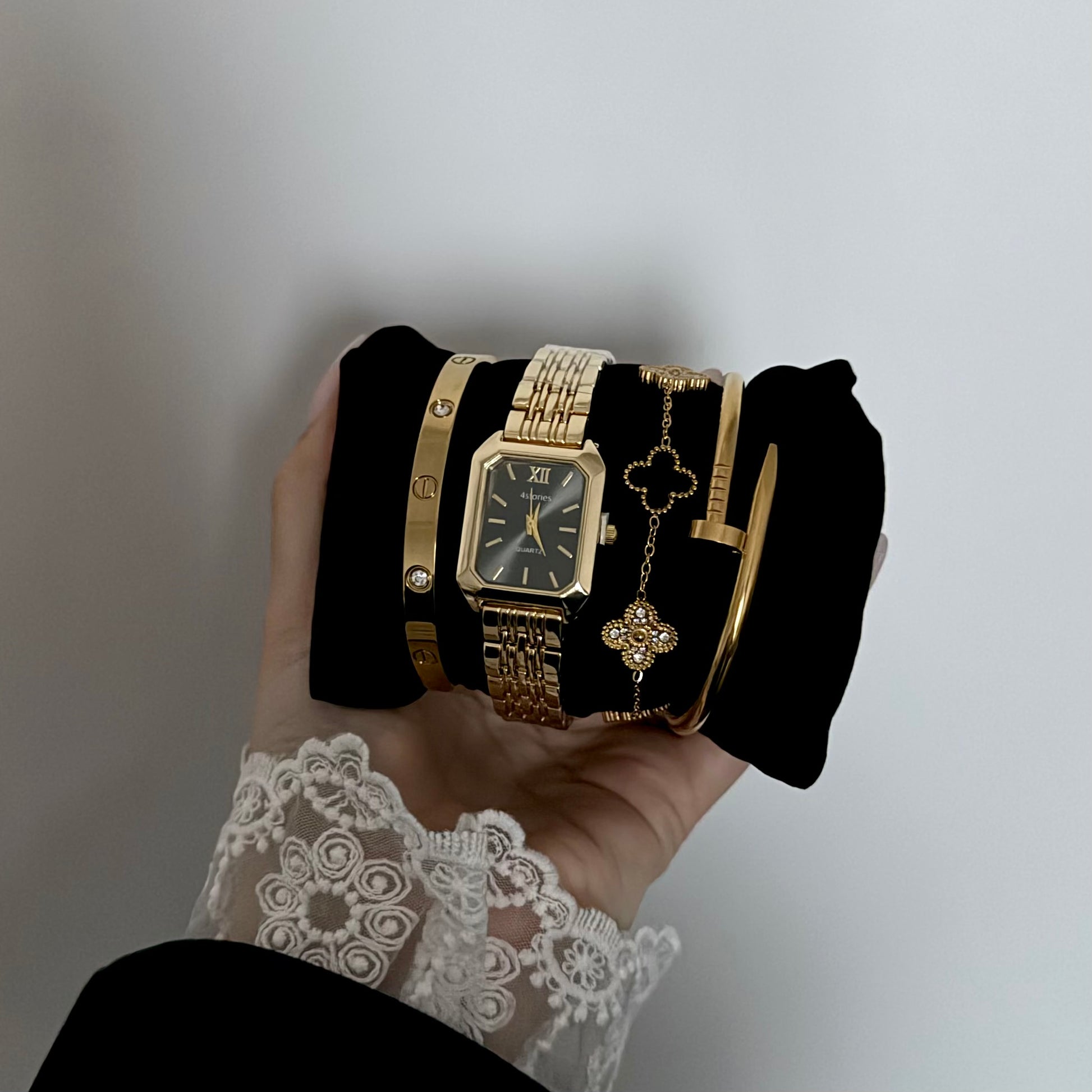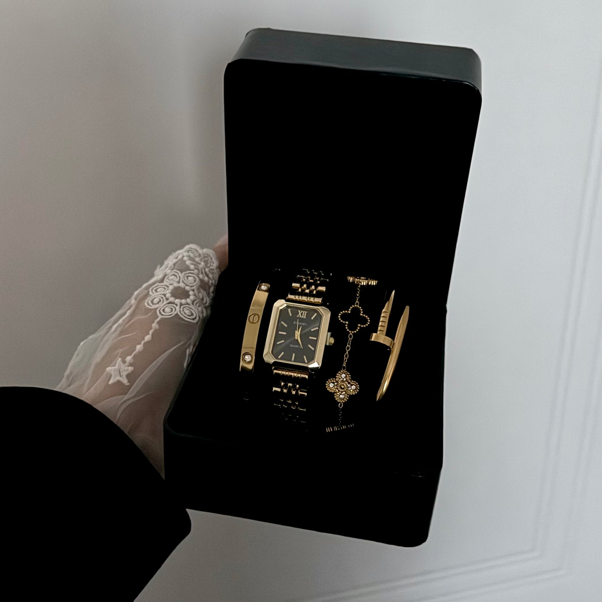 Zestaw składa się z zegarka oraz trzech bransoletek wykonanych ze stali chirurgicznej. Całość zapakowana jest w elegancką szkatułkę — idealną na prezent. Bransoletki są odporne na wodę, nie uczulają i nie ciemnieją.
