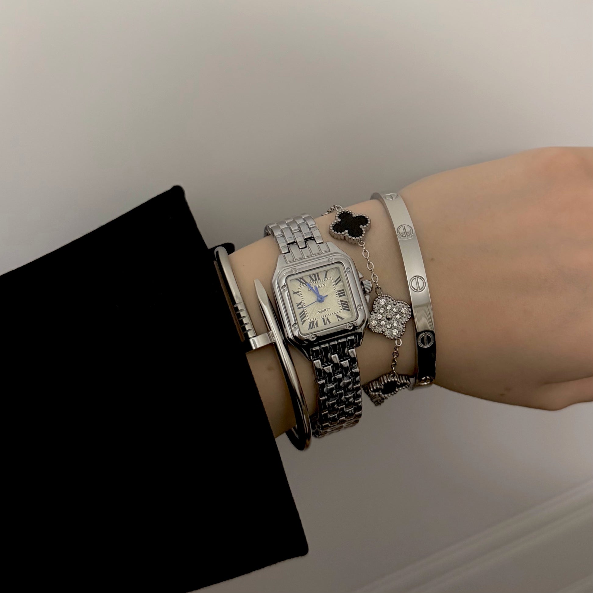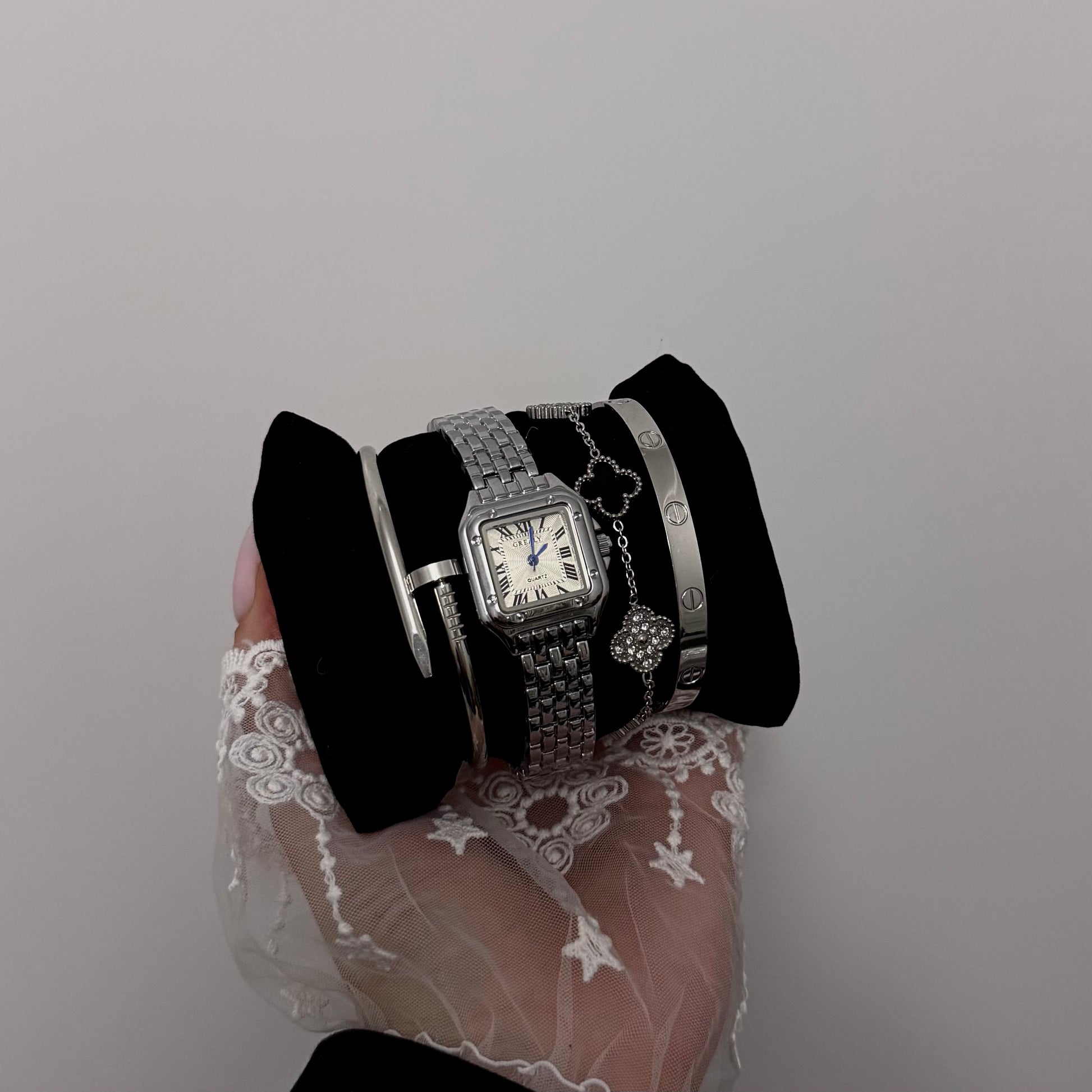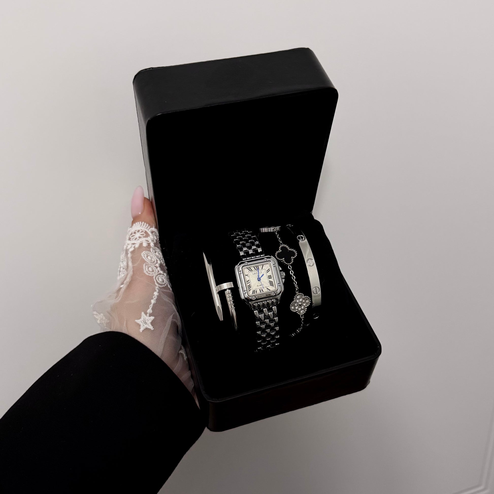 Zestaw składa się z zegarka oraz trzech bransoletek wykonanych ze stali chirurgicznej. Całość zapakowana jest w elegancką szkatułkę — idealną na prezent. Bransoletki są odporne na wodę, nie uczulają i nie ciemnieją.