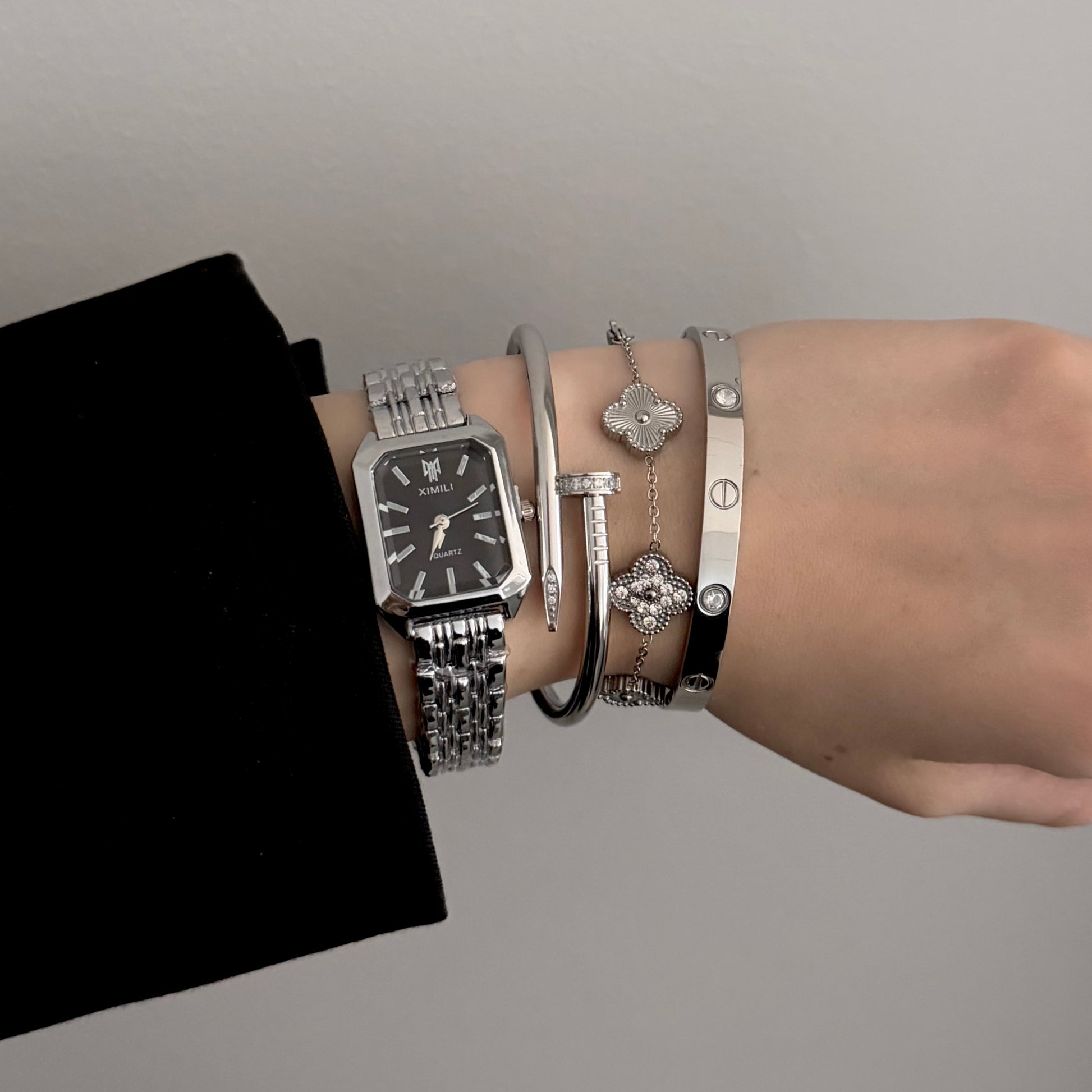 Zestaw składa się z zegarka oraz trzech bransoletek wykonanych ze stali chirurgicznej. Całość zapakowana jest w elegancką szkatułkę — idealną na prezent. Bransoletki są odporne na wodę, nie uczulają i nie ciemnieją.
