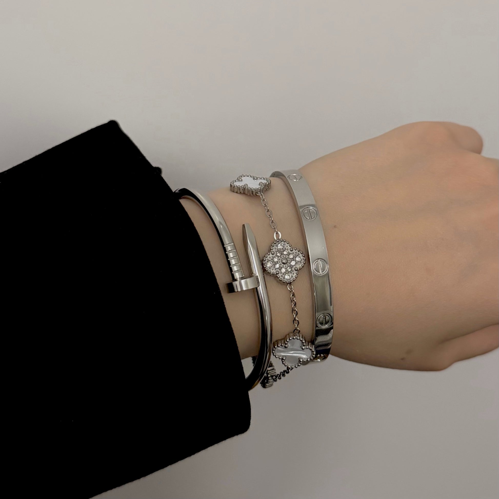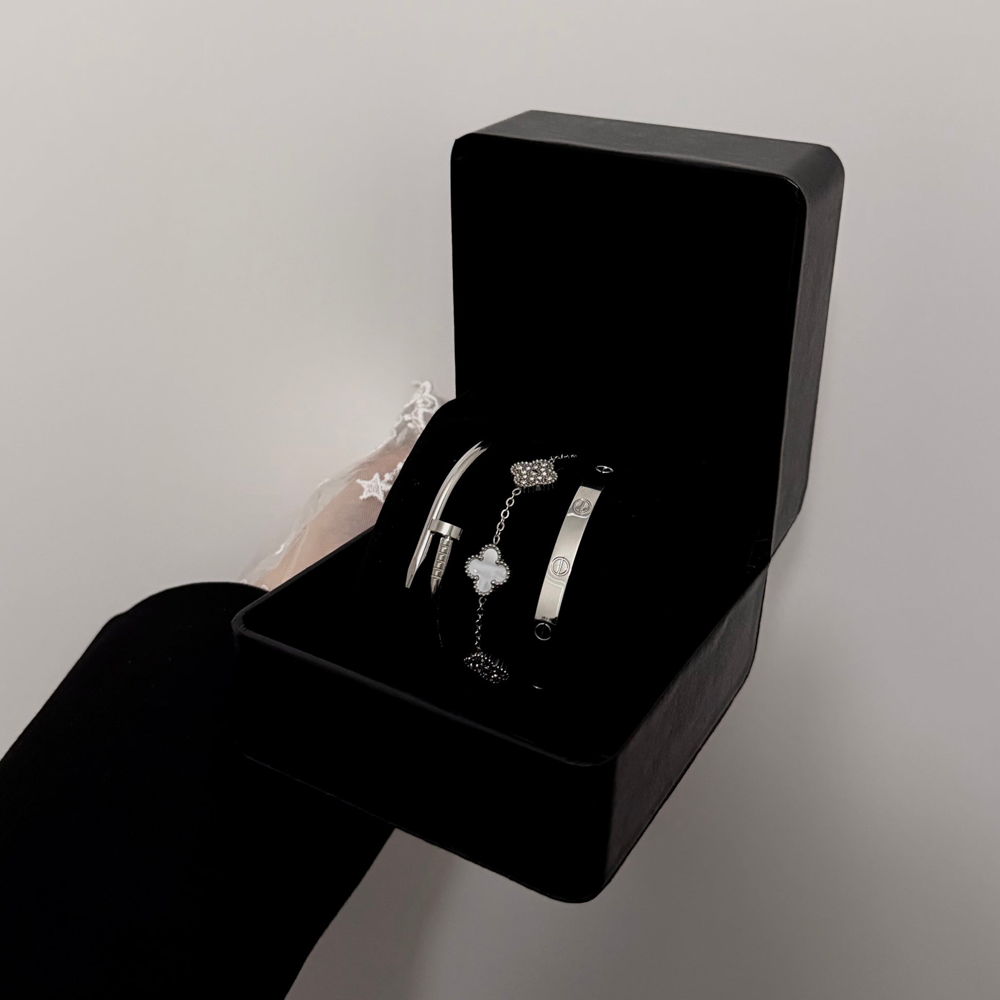 Zestaw składa się z 3 bransoletek ze stali chirurgicznej, pakowany w elegancką szkatułkę. Bransoletki są odporne na wodę, nie uczulają i nie czernieją.