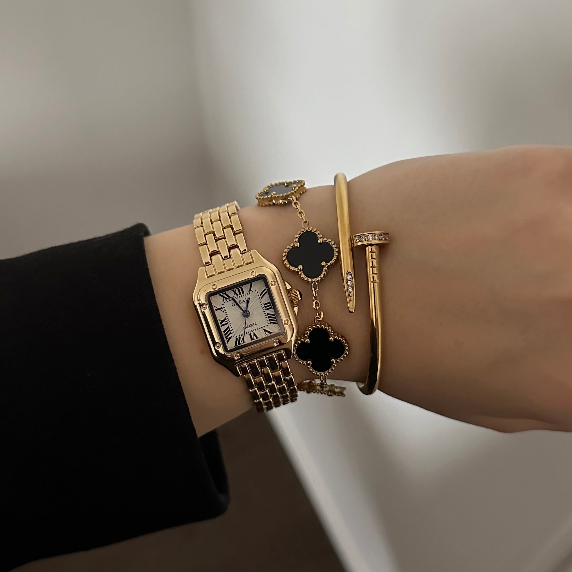 Zestaw zawiera 2 bransoletki i zegarek zaprezentowane na zdjęciu. Zestaw jest zapakowany w elegancką szkatułkę.
