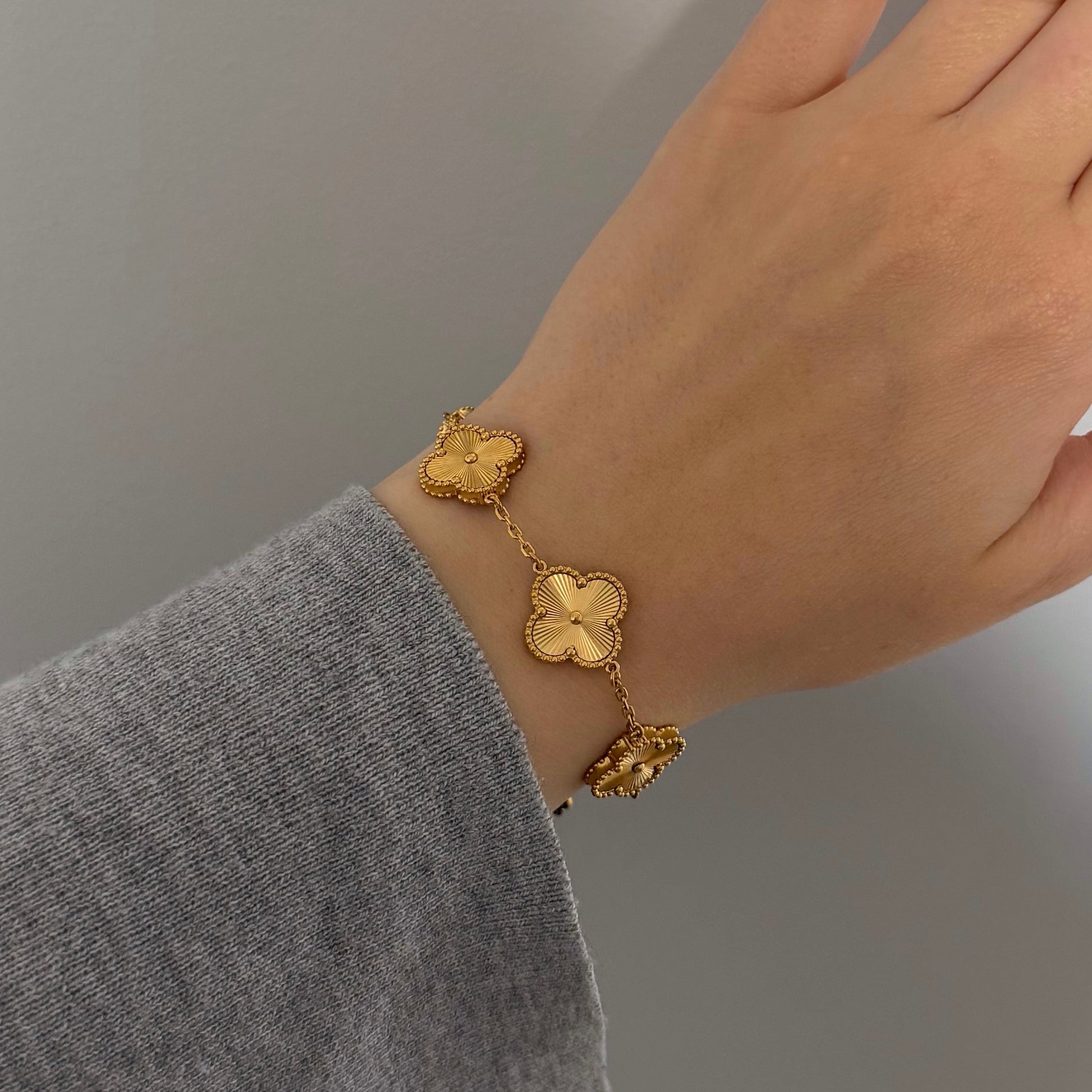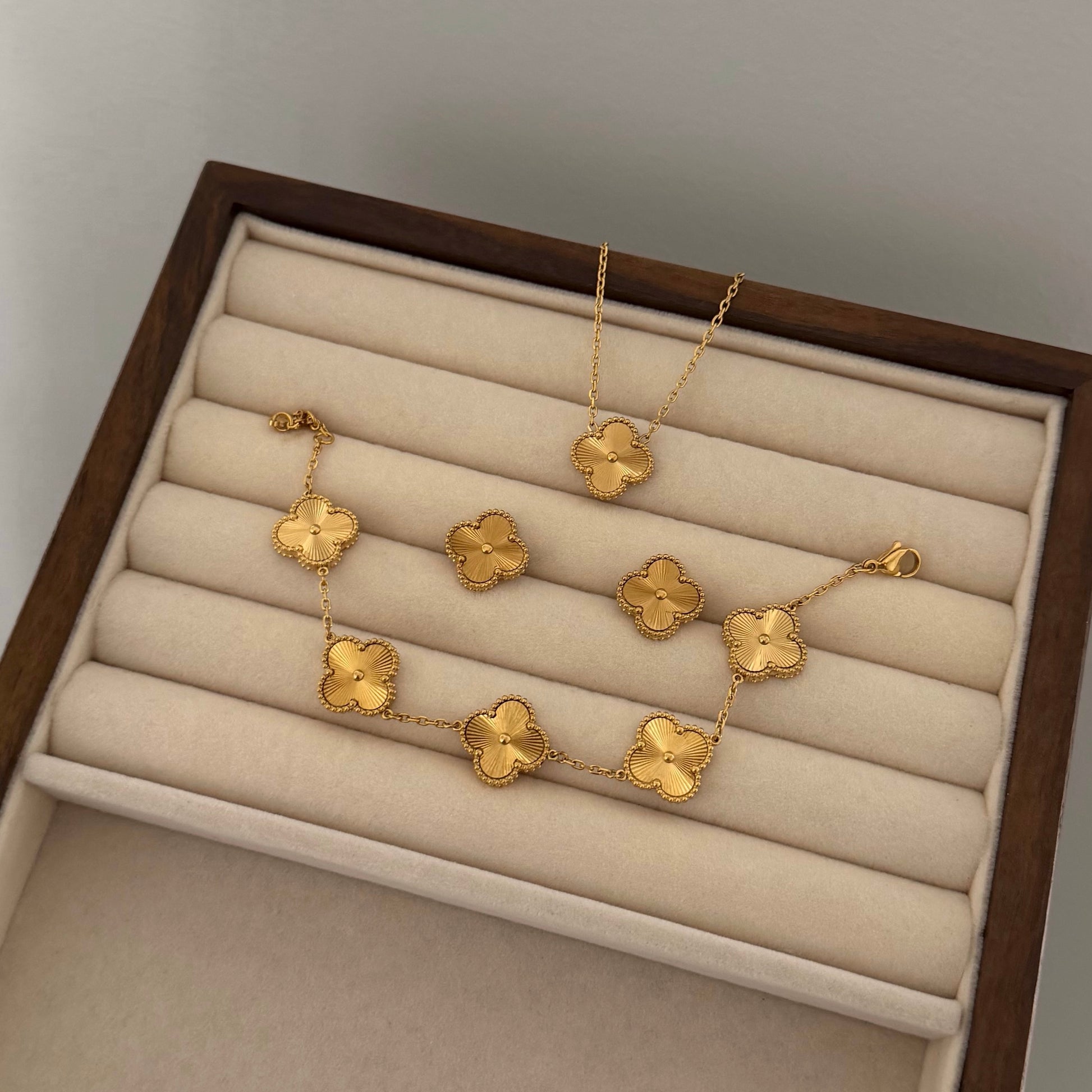 Biżuteria wykonana ze stali chirurgicznej, odporna na wodę, nie czernieje, nie uczula. Zestaw zawiera naszyjnik, kolczyki i bransoletkę. Koniczynki obustronne o średnicy 15 mm, bransoletka dodatkowo wzmocniona.
