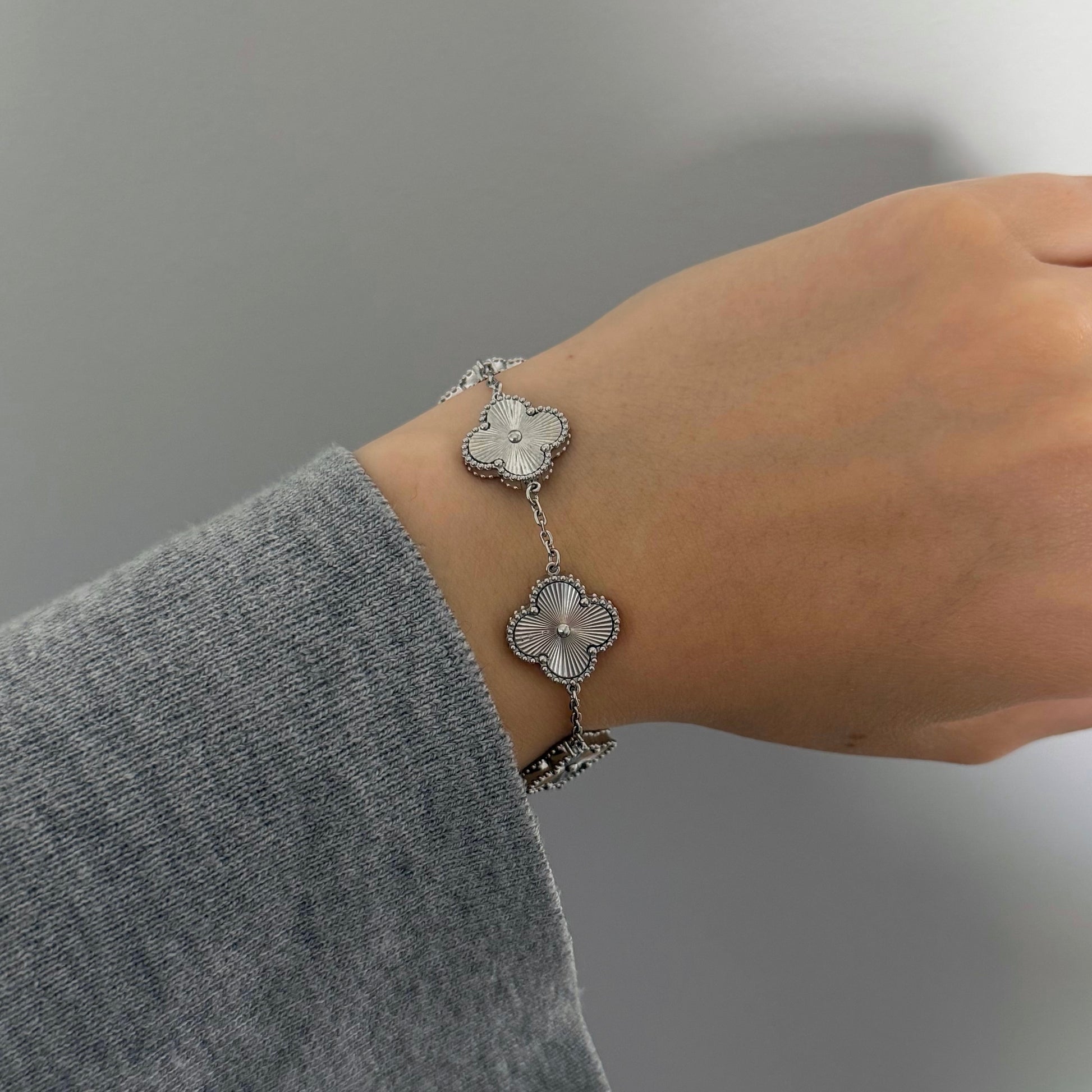 Biżuteria wykonana ze stali chirurgicznej, odporna na wodę, nie czernieje, nie uczula. Zestaw zawiera naszyjnik, kolczyki i bransoletkę. Koniczynki obustronne o średnicy 15 mm, bransoletka dodatkowo wzmocniona.