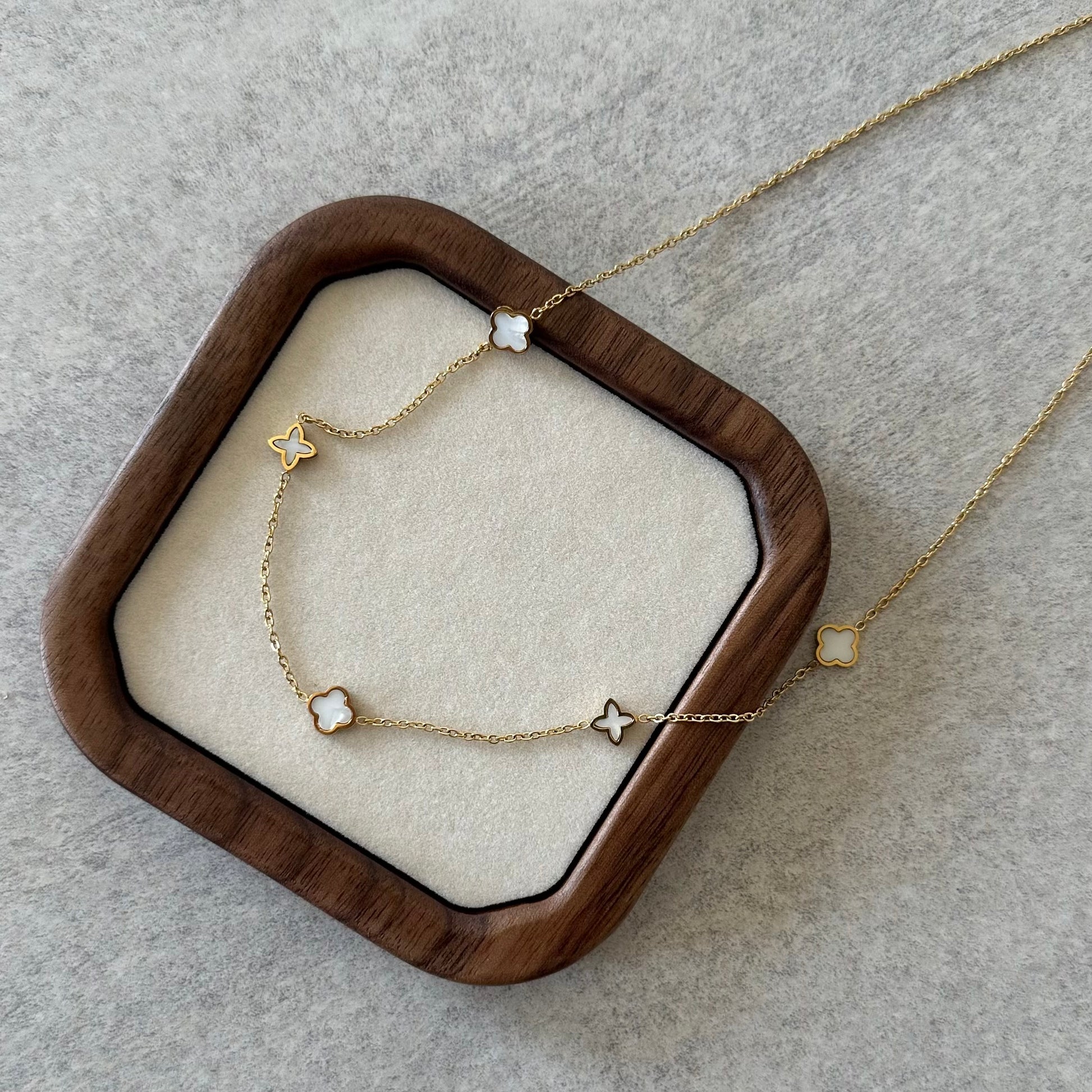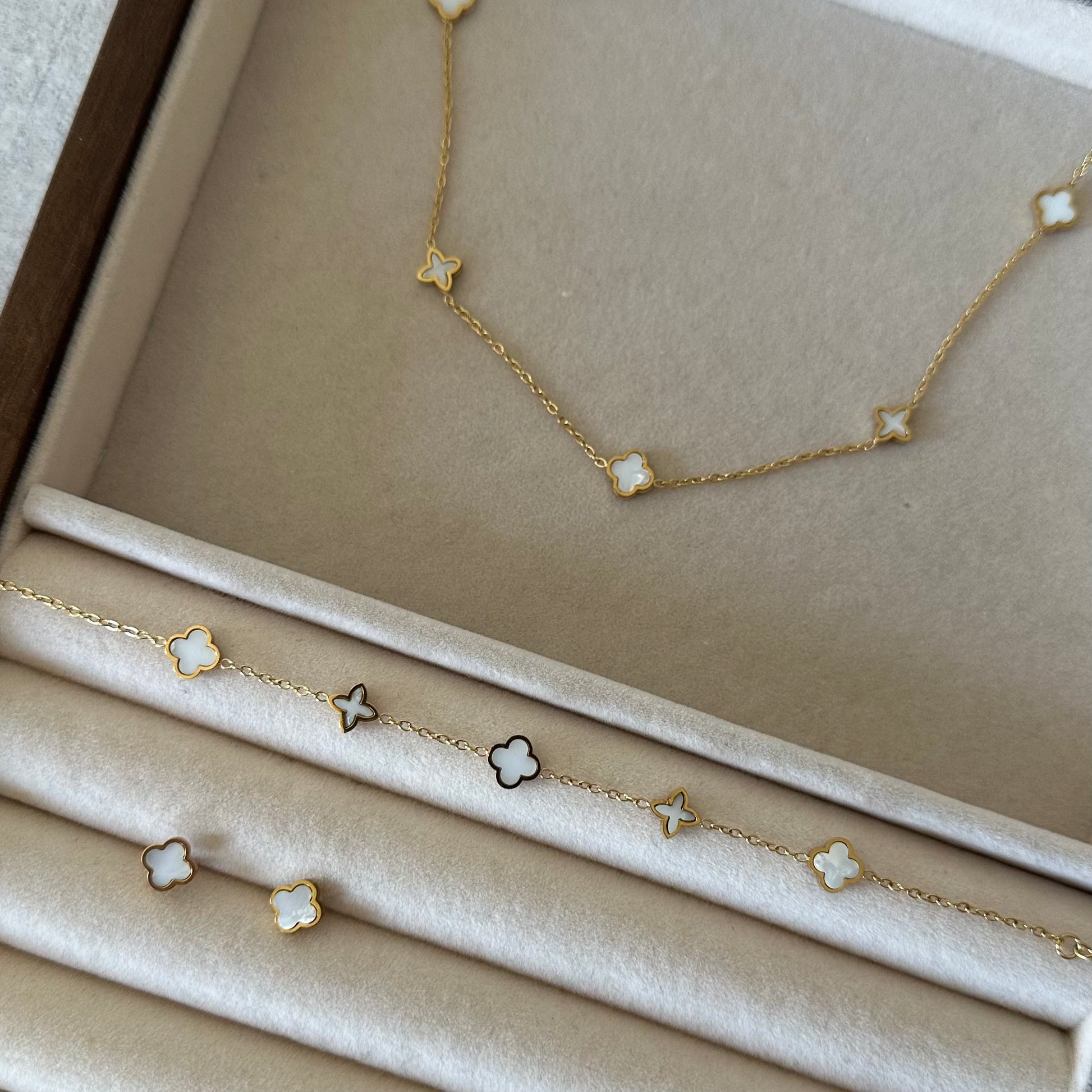 Biżuteria wykonana ze stali chirurgicznej, odporna na wodę, nie czernieje, nie uczula. Zestaw zawiera naszyjnik, kolczyki i bransoletkę. Koniczynki o średnicy ok 8 mm.