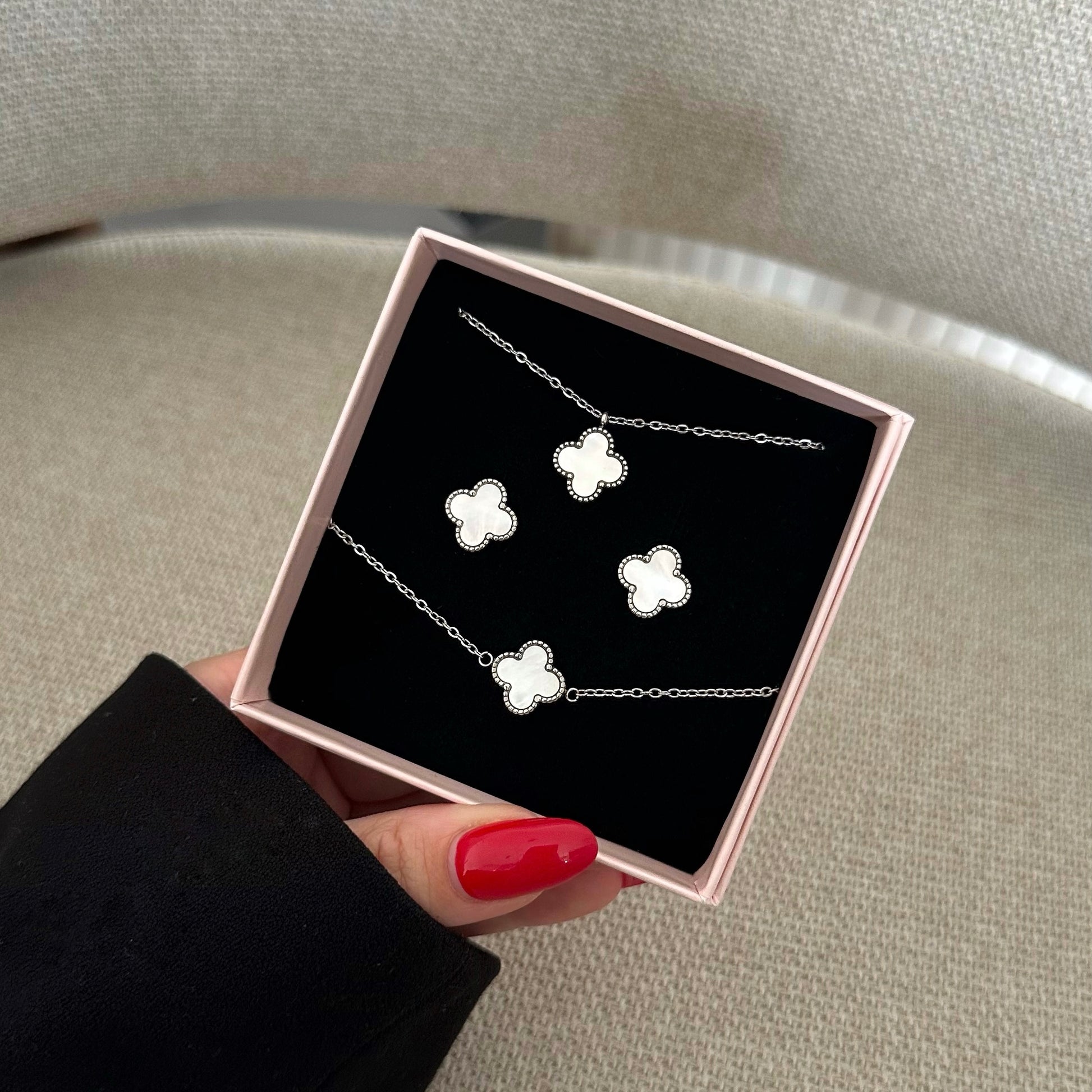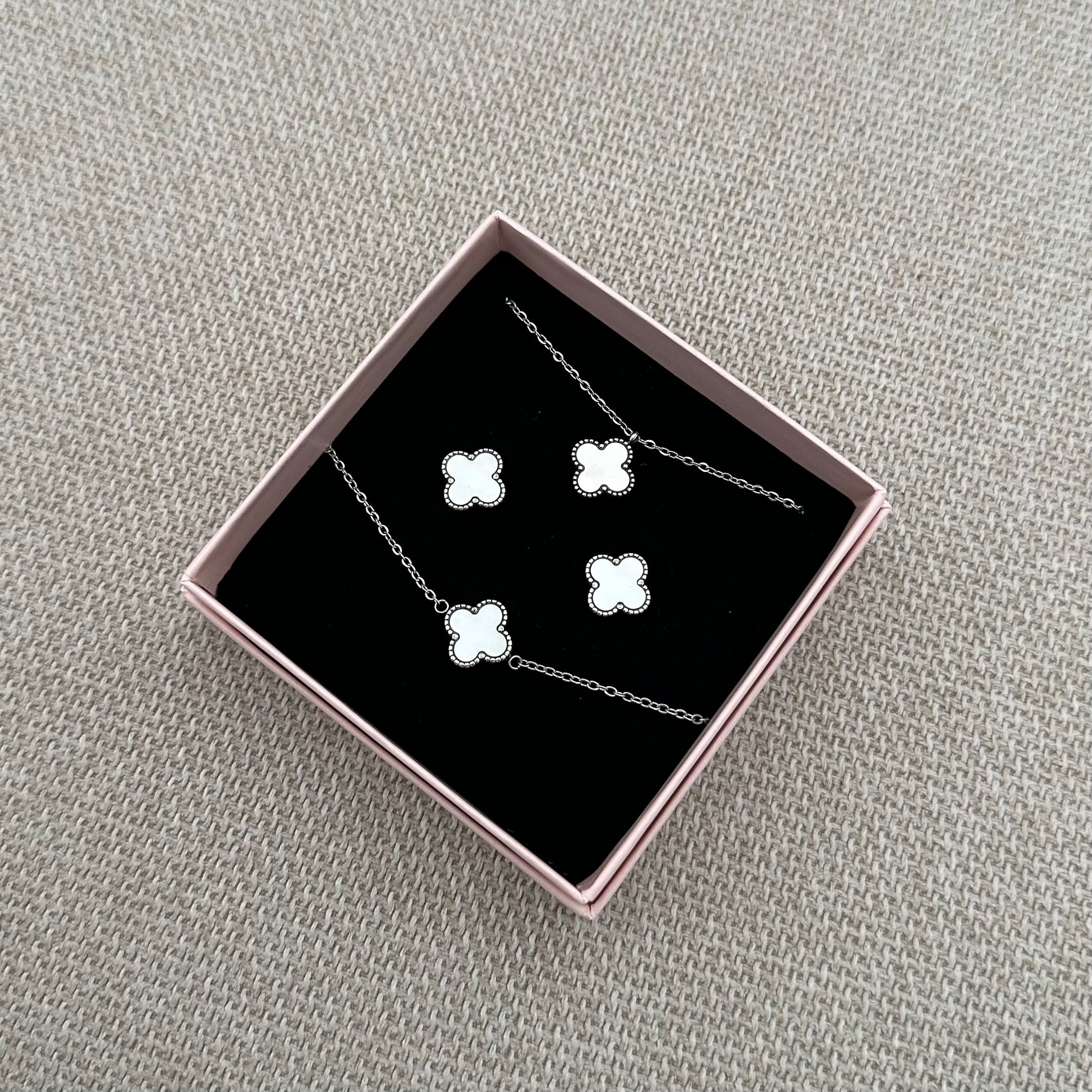 Zestaw wykonany ze stali chirurgicznej, jest odporny na wodę, nie uczula i nie czernieje. Zestaw w kolorze srebra z perłową koniczynką.