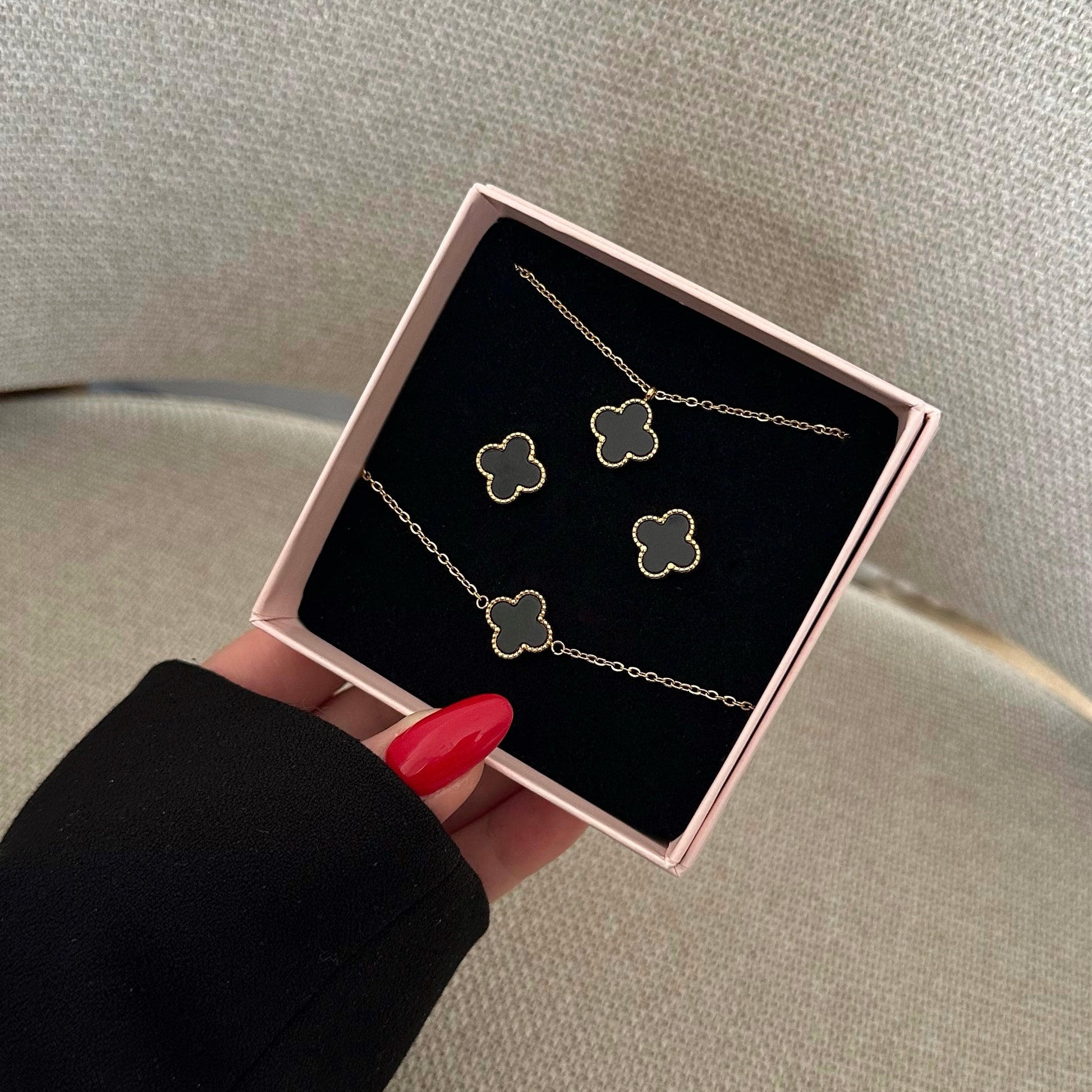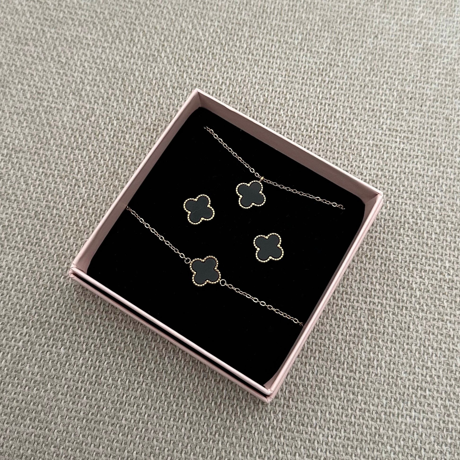 Zestaw wykonany ze stali chirurgicznej, jest odporny na wodę, nie uczula i nie czernieje. Zestaw w kolorze złota z czarną koniczynką.