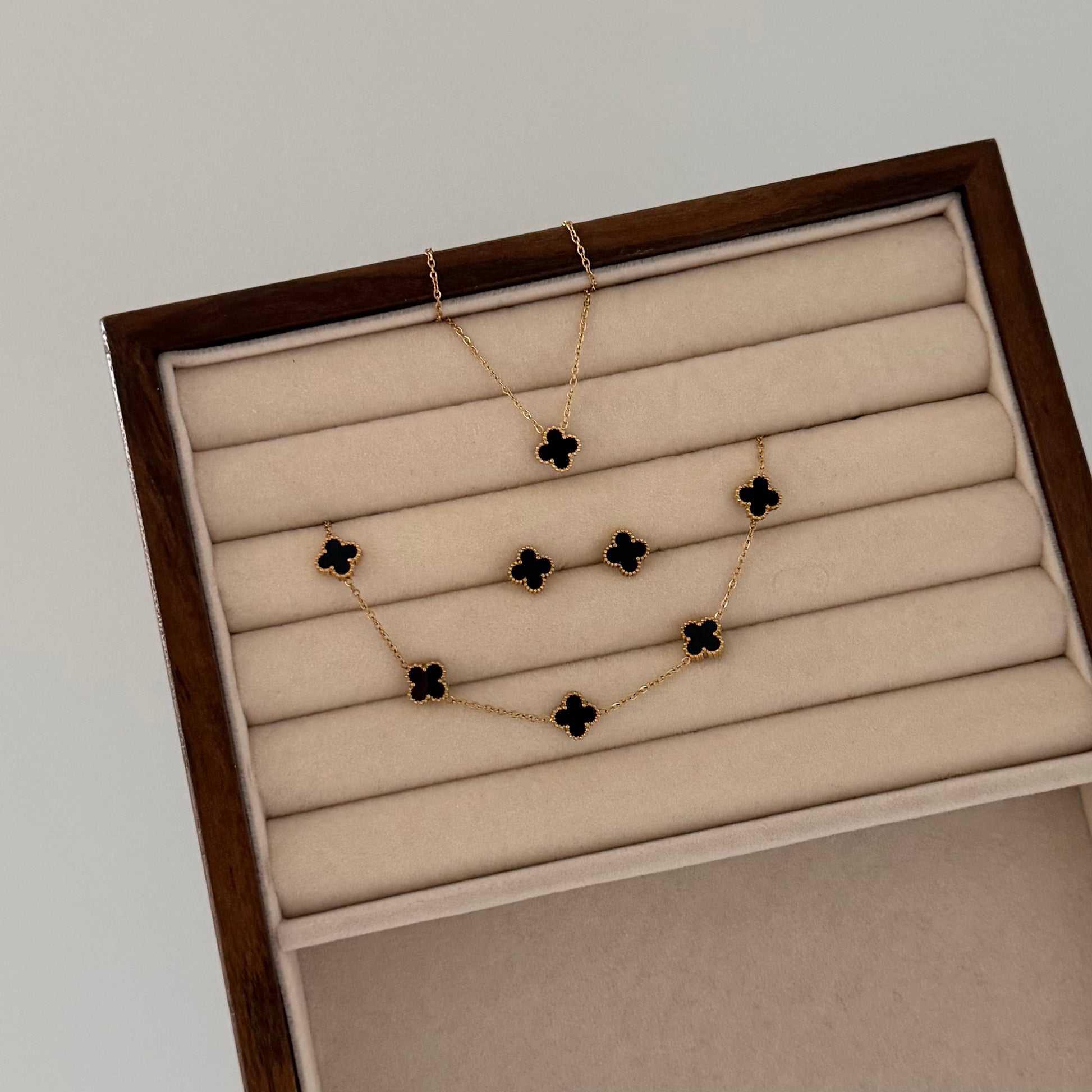 Zestaw zawiera naszyjnik, kolczyki i bransoletkę. Średnica koniczynki 9 mm. Zestaw pakowany w pudełeczko na prezent.