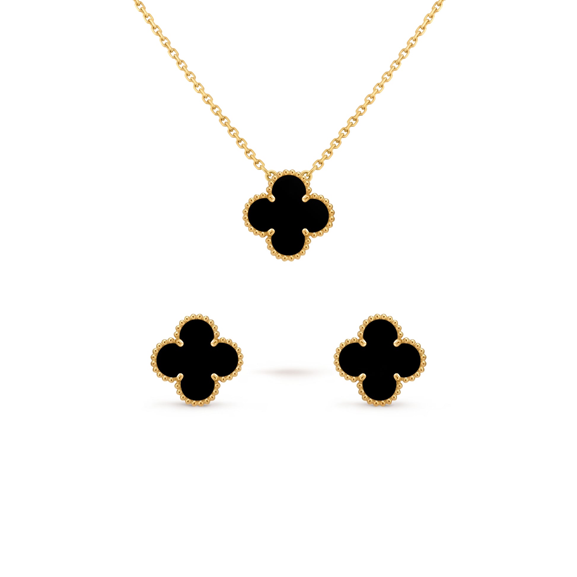 Zestaw wykonany ze stali chirurgicznej — jest wodoodporny, nie uczula i nie ciemnieje. W komplecie znajduje się naszyjnik oraz kolczyki. Średnica koniczynki: 15 mm.