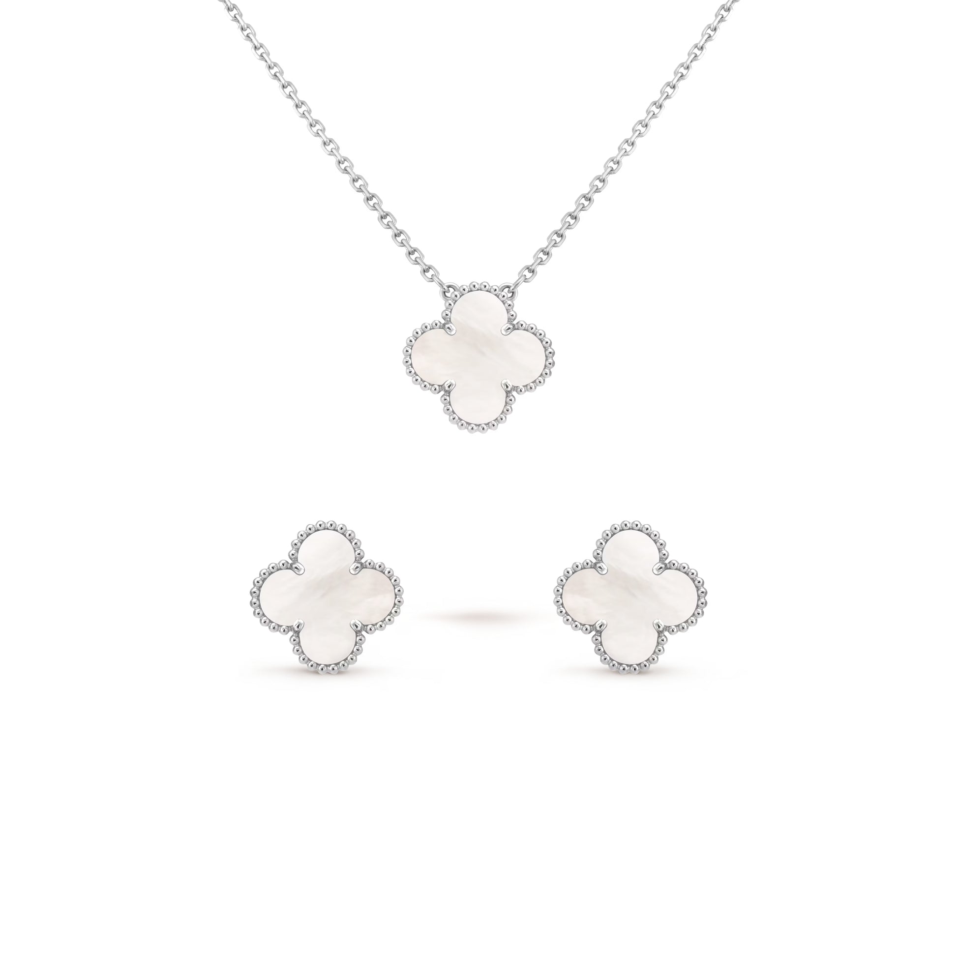 Zestaw wykonany ze stali chirurgicznej — jest wodoodporny, nie uczula i nie ciemnieje. W komplecie znajduje się naszyjnik oraz kolczyki. Średnica koniczynki: 15 mm.