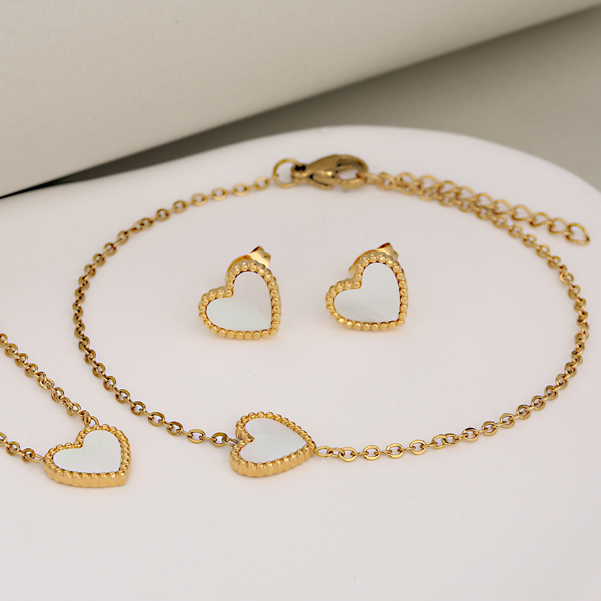 Zestaw wykonany ze stali chirurgicznej, jest odporny na wodę i nie czernieje. Zawiera naszyjnik, kolczyki i bransoletkę. Średnica serduszka 9 mm.